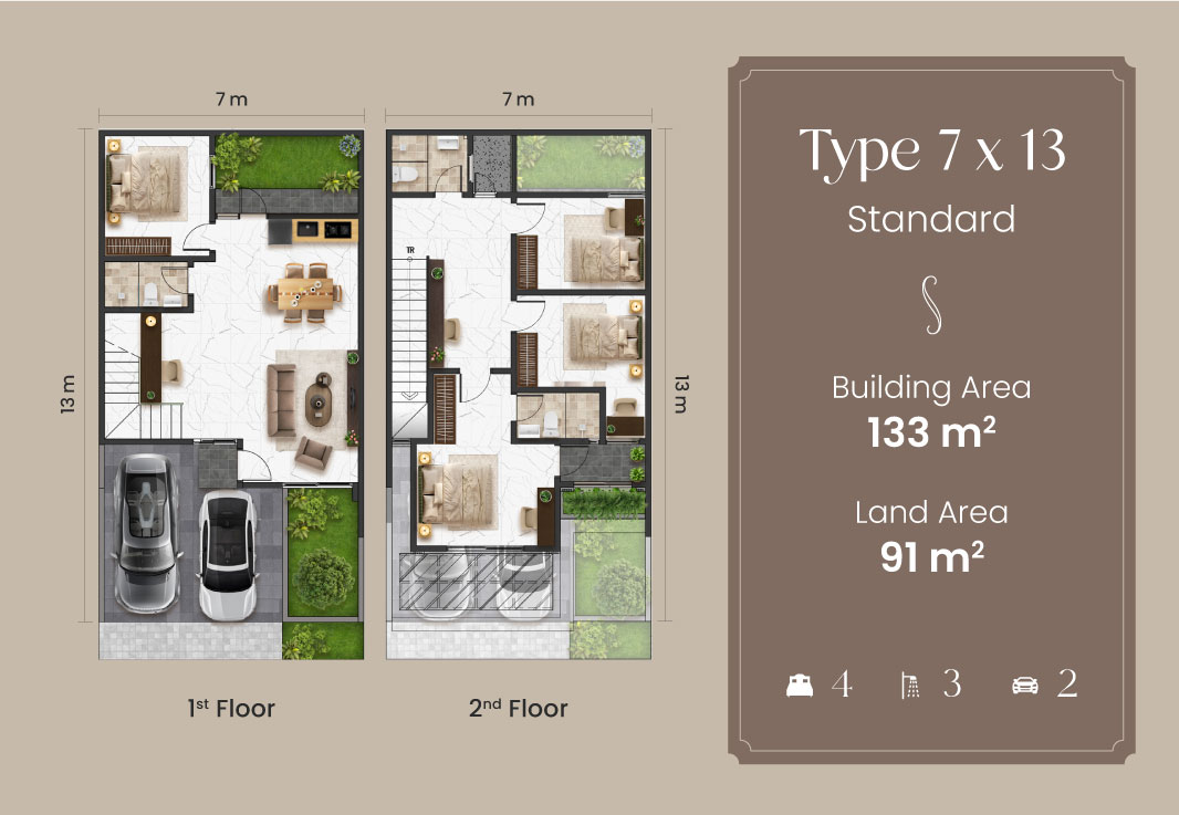 A graceful interpretation of classic contemporary living, the 7×13 two-storey residence at Achillea Cluster Bintaro is designed to offer generous space and refined comfort for the modern family. Its balanced architectural proportions, paired with timeless design elements, create a home that feels elegant, welcoming, and enduring. Each level is thoughtfully arranged to support both shared moments and personal privacy within a harmonious living environment.